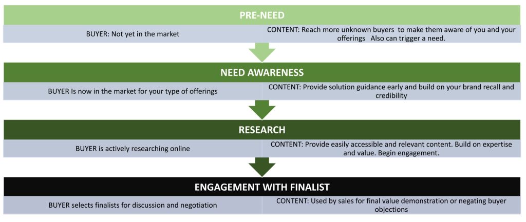 Unatoč dokazima, staromodni predstavnici prodaje i dalje se protive: izjavljujući: „Mi proizvodimo! Ne prodajemo proizvode direktno javnosti. Ne trebamo online marketing. Mi smo drugačiji!“ Ovo jednostavno nije tačno. Industrijski prodajni procesi i prodaja potrošačima su različiti: ali faze kupovine su suštinski iste. Koristite sljedeću grafiku kako biste razumjeli važnost odgovarajućeg sadržaja.